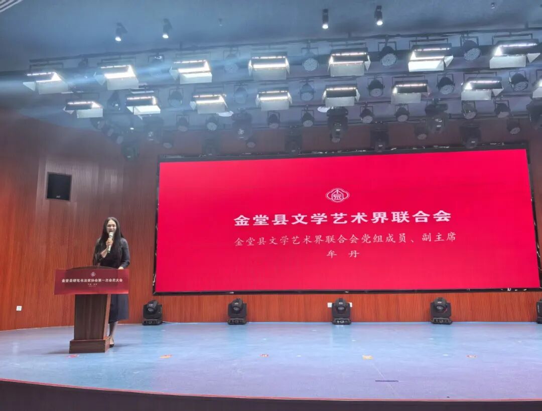 牟丹在讲话中对金堂县硬笔书法家协会的正式成立致以了热烈的祝贺,对省市硬协长期以来关心支持金堂县域文艺和硬笔书法事业发展表示了衷心的感谢。同时,为协会后续高质量发展提出三点工作希望:一是坚持党建引领根本方向,健全协会组织架构,规范内部管理运行,坚守艺术初心、坚持守正创新;二是广泛凝聚广大会员合力,深化行业交流互鉴,抱团协同发展,凝聚书法事业发展向心力;三是深耕文化惠民实践工作,常态化开展公益书法普及活动,传承弘扬中华优秀汉字书法文化。