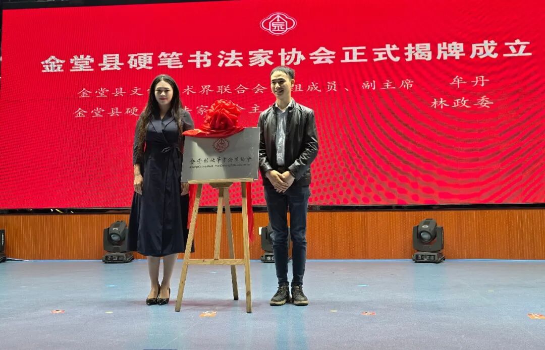 大会现场举行庄重的协会揭牌仪式,牟丹与新当选金堂县硬笔书法家协会主席林政委共同为协会揭牌,这一刻标志着金堂县硬笔书法家协会正式宣告成立,县域硬笔书法发展迈入规范化、专业化、组织化全新阶段。