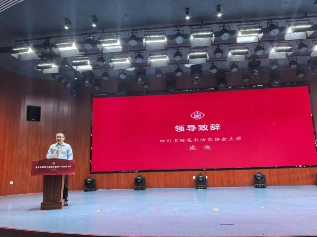 康俊在致辞中首先对金堂县硬笔书法家协会揭牌成立表示了诚挚的祝贺。他表示,金堂硬协的组建成立,补齐了县域硬笔书法专业组织建设短板,为全省基层硬笔书法事业发展注入全新动能。他寄语协会始终坚持政治引领、坚守文艺使命,深耕书法艺术创作与美育普及,主动服务基层群众文化需求,持续守正创新、深耕主业发展。同时明确,四川省硬笔书法家协会将持续强化业务指导、资源赋能与工作帮扶,全力助推金堂县乃至全省硬笔书法事业稳步提质、协同发展。