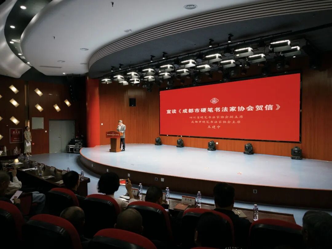 王建中代表成都市硬笔书法家协会致辞祝贺。他表示,成都市硬协将与金堂硬协紧密联动、携手同行,全方位支持金堂硬笔书法事业建设发展,合力推进市域硬笔书法事业高质量协同发展,祝愿金堂硬笔翰墨事业薪火相传、蒸蒸日上!