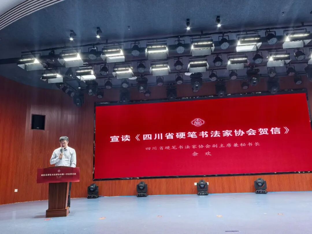 会上,余欢宣读了《四川省硬笔书法家协会贺信》。贺信寄语金堂县硬笔书法家协会立足新起点、扛起新使命,凝聚行业各方力量,持续提升协会凝聚力、影响力和号召力,打造县域硬笔书法文化建设标杆阵地。相信在省市县各级协会和广大书法同仁共同努力下,金堂硬协必将为县域文化事业繁荣发展赋能添彩,为区域文化强市、文化强县建设书写翰墨新篇章。